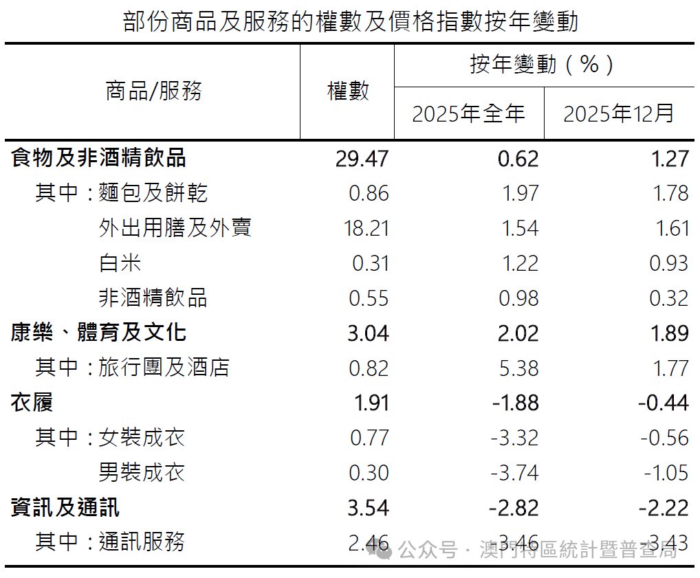 2025年第4季综合消费物价平均指数同比上升0.67%,甲类及乙类消费物价平均指数分别上升0.61%及0.72%;与2025年第3季比较,综合消费物价平均指数上升0.27%。
